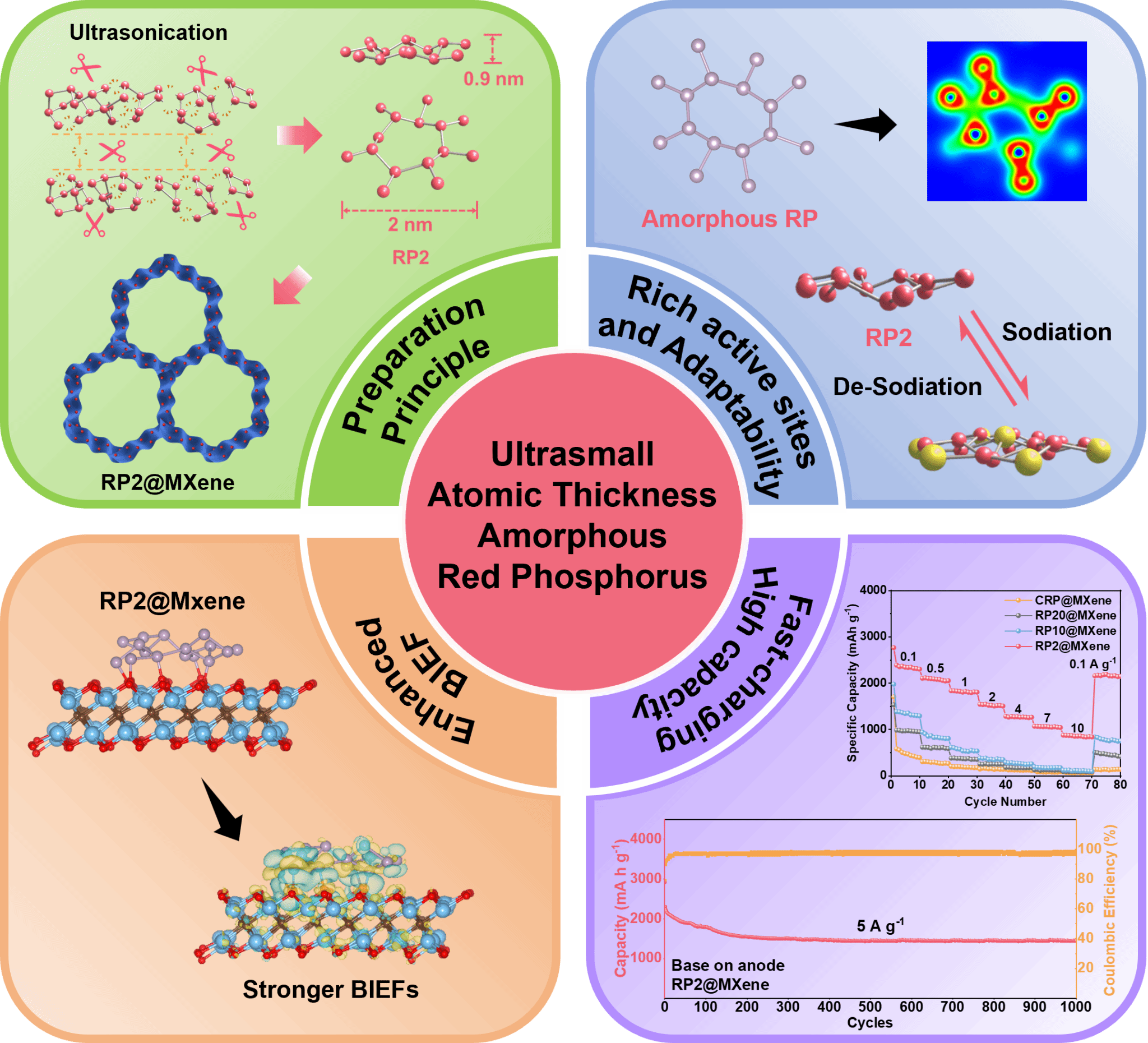 该论文开创性地将超小超薄非晶理念运用于钠离子电池电极材料设计。研究团队开发的制备技术可成功获得原子级厚度的超小尺寸非晶红磷,随后通过巧妙构建三维复合电极结构,有效解决了钠离子电池在快充条件下动力学缓慢和体积膨胀严重的瓶颈难题。理论计算证实了非晶结构具有独特的电子分布和丰富的活性位点,而复合电极的界面工程设计显著增强了电荷传输效率。电化学性能测试结果显示所研发钠离子电池具备优异的快充能力和循环稳定性。该研究工作创新的电池设计理念和优越的电化学性能可为钠离子电池开发提供了新方向,同时显示出其巨大的应用价值,对推动下高性能钠离子电池技术的发展具有重要意义。本研究得到了国家自然科学基金重点项目、山西省科技成果转化引导专项、山西省科技合作交流专项等多项基金资助,体现了我院在新型储能电池研究领域的创新实力和学术影响力。