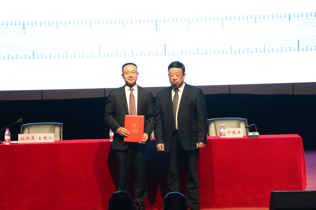 向“百年百强”的目标迈进,报告会前,校长刘有智教授为何朝兵先生颁发客座教授聘书。