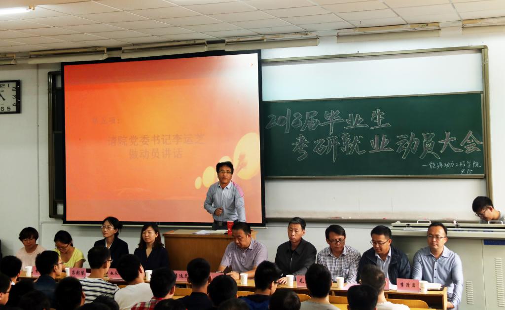 距离2018届毕业生参加研究生入学考试还有100天时间,为鼓舞考研学生士气,也为了让就业学生明确就业目标和努力方向,能源动力工程学院于9月15日上午10点30在08202教室举行能源动力工程学院2018届毕业生考研就业动员大会。出席大会的领导嘉宾有校招生与就业工作处副处长刘宝华,院党委书记李运芝,院副院长张翼,2018届毕业生班主任及各科室负责人,2018届全体研究生、本科生参加了大会。会议由院党委副书记兼副院长赵永娟主持。