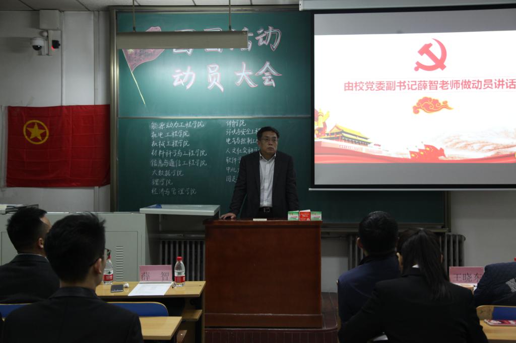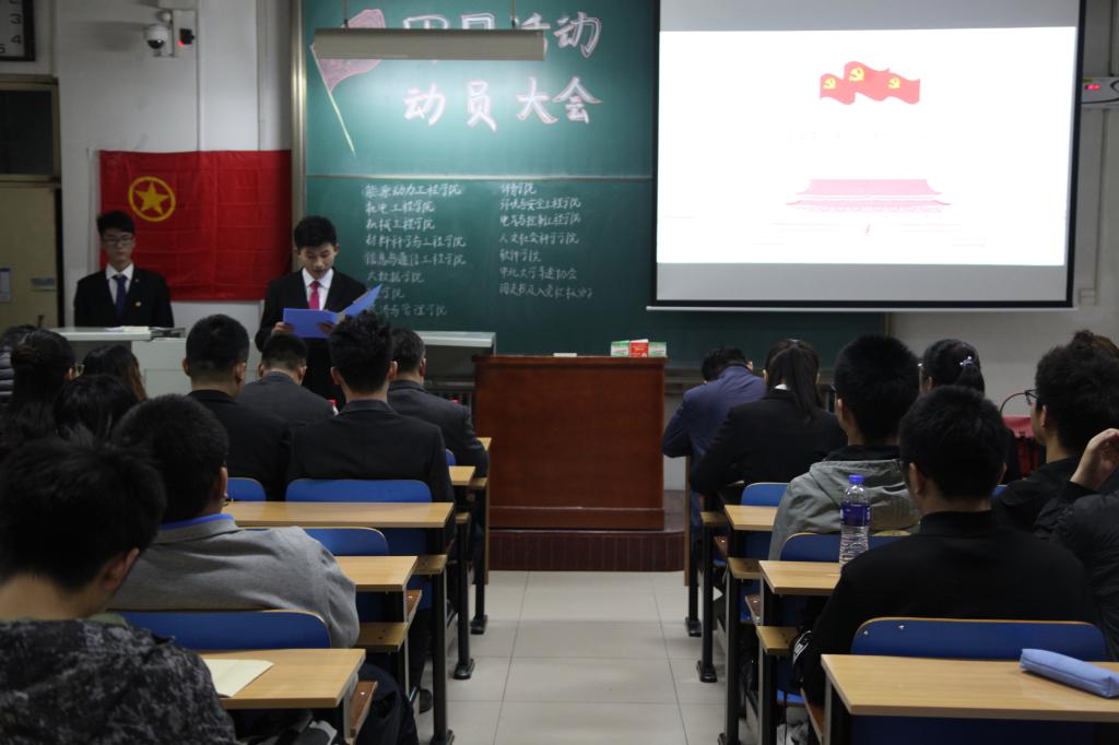 全体人员在庄重的团歌中起立并唱团歌;随后,来自主办方能源动力工程学院的魏煜坤同学介绍活动安排,详细的方案,掷地有声的话语,展现了能动学院学生的精神风貌;由材料科学与工程学院李鑫同学作为学生代表发言,作为学生如何献礼十九大,由机械工程学院的曹江河同学带领全体团员青年宣誓。最后,由校党委副书记薛智老师做动员讲话,薛书记动员同学们要不忘初心,牢记使命,高举中国特色社会主义伟大旗帜,为实现中华民族伟大复兴的中国梦不懈奋斗。