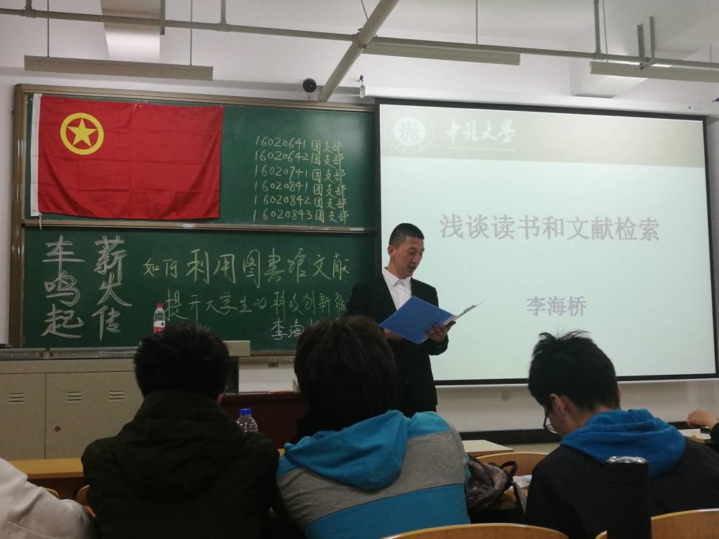 本周五晚,能源动力工程学院大二的六个班来了一次大集会,大二的老腊肉们坐满了15106教室。这正是本次的联合团日活动《车鸣起 薪火传——如何利用图书馆文献资料提高大学生的科技创新能力》讲座现场!