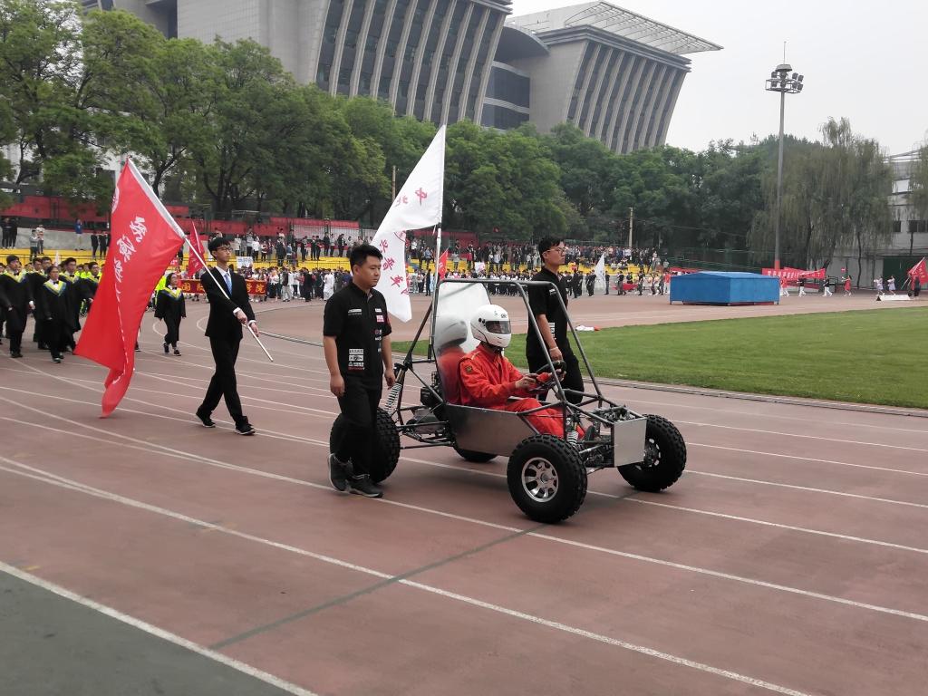 据悉,这辆赛车将代表学校出战7月中旬的“2018中国大学生巴哈汽车大赛”,这也是山西省学子第一次参加该赛事。在车展现场看到,整车底盘较高,车身以黑色为底色,上面贴有各种赞助商标志,短小精悍。车队指导老师尉庆国表示,baja越野赛车设计最高车速60km/h,整车整备质量仅240kg,整车的设计、加工、装配、调试完全由学生自己完成。车队通过不断摸索,借参加中国大学生方程式汽车大赛的机会,多次到兄弟学校赛车实验室交流、学习,汲取经验;赛车受力、运动、转弯、振动都经过精细计算,各部分结构和强度设计都经过理论计算,并用相关软件进行拟合运算,确保每个部件安全可靠,最后着手制作出图,从切钢管焊接车架开始,他们仅用时13天便实现了整车落地,并参加了能源动力工程学院在校运动会入场方阵表演。