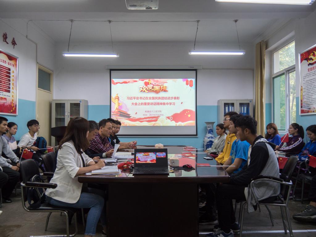 2019年9月29日能源动力工程学院于诚学楼201会议室召集学院少数民族学生集中学习习近平总书记在全国民族团结进步表彰大会上的重要讲话精神,院长刘汉涛、院党委副书记兼副院长任雁、学生科叶增民、辅导员杨勇出席此次会议。