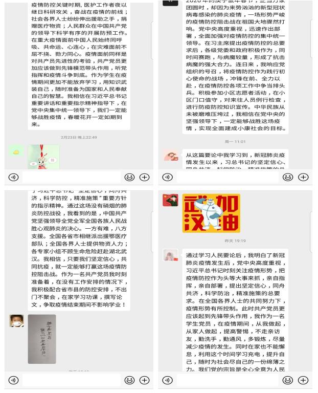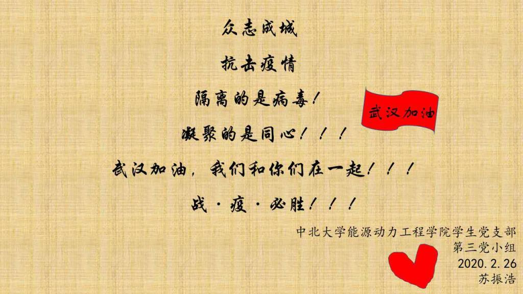 疫情防控工作的精神,提高党员的党性修养,发挥党员的先锋模范带头作用,能源动力工程学院党委号召广大党员同志通过各种不同的形式积极开展防控工作,并组织各党支部于2020年2月下旬至3月上旬相继开展了“同心战疫,党员先行”的线上主题党日活动。有的支部书写了抗击疫情加油诗歌、有的支部拍摄了加油视频、还有的支部党员争当防疫志愿者,学院每一位党员在疫情防控工作中做到“主动有活干、主动有事做”。