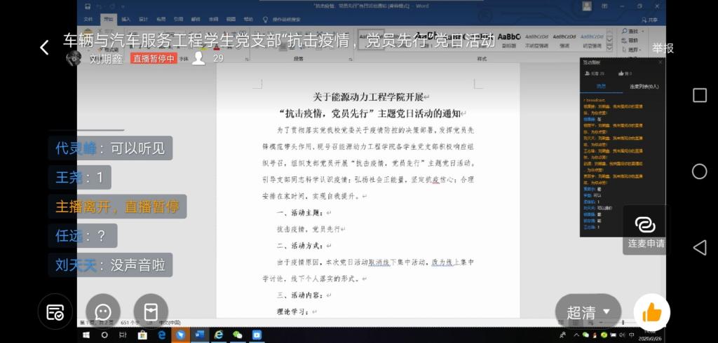 2月27日能源与动力工程学生党支部共同学习了习近平总书记在《统筹推进新冠肺炎疫情防控和经济社会发展工作部署会议的讲话精神》,了解了疫情防控的基本知识及注意事项。疫情就是命令,防控就是责任,广大党员夜以继日奔赴抗击疫情第一线,将一句句铿锵的入党誓词化作保护人民安全健康的防疫行动,值得每一名党员学习。