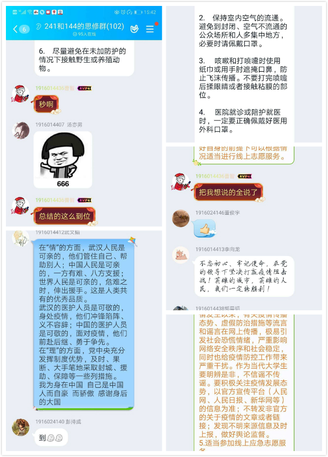 课程过后,同学们在线上展开了积极讨论。一位大四准毕业生说:“管住自己、帮助别人,武汉人民是可亲的;一方有难、八方支援,中国人民是可亲的;危难之际,伸出援手,世界人民是可亲的。我为自己身在中国而骄傲,为自己是一名中国人而骄傲,感谢伟大的祖国伟大的党。”