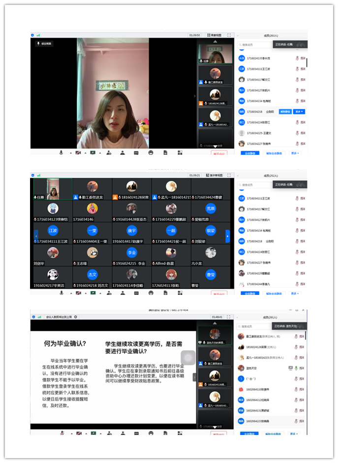 李清岩老师为同学们详细讲解了助学贷款的还款事宜,并为同学们在线答疑。毕业生们纷纷表示在今后的学习、工作、生活中会不忘初心,端正态度,诚信做人,砥砺前行。大会最后,李老师为同学们送出了:“乾坤未定,你我皆是黑马”的祝福。