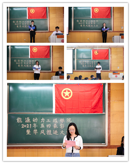 大会在激昂的团歌歌声中拉开了序幕。院长刘汉涛做2020到2021学年的学风情况总结及本学期学风推进计划,从往期各学年的考研率、英语四级通过率、挂科率等方面做出总结,并提出了本学期学风工作目标。随后,党生焕老师宣读《能源动力工程学院关于表彰2020年度团内先进集体和优秀个人的决定》,张翼老师宣读《能源动力工程学院关于表彰“七色光”育人标兵的决定》,“七色光”育人标兵分别是:红色铸魂标兵、橙色暖心标兵、黄色润心标兵宿舍、绿色助力标兵、青色领军标兵、蓝色强基标兵宿舍、紫色成长标兵,他们是学院在“学在能动,追求卓越”育人理念下,选树的在党员、学习、助学、心理、宿舍卫生、学生骨干、就业等方面的标兵榜样。王强老师宣读《能源动力工程学院关于表彰2020/2021学年优秀学生干部团队的决定》,王慧奇老师宣读《能源动力工程学院关于表彰2019/2020学年学业进步奖的决定》,叶增民老师宣读《能源动力工程学院关于表彰四级通过率前三名的决定》,并对以上集体和个人进行颁奖。