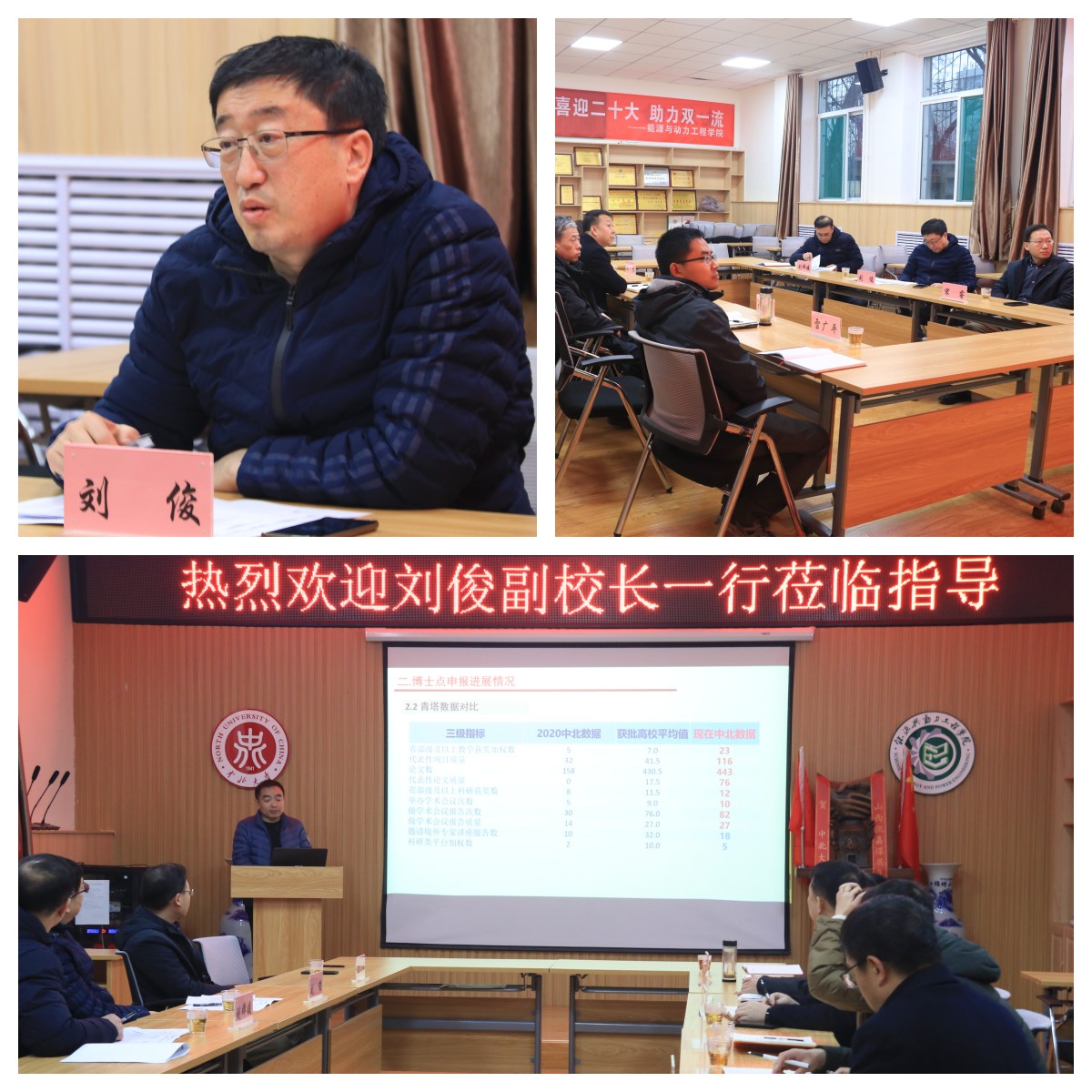 最后,刘俊副校长认真听取了学院整体以及学科建设情况的汇报,就汇报过程中发现的关键问题进行了详细询问并给出具体的指导意见。刘俊副校长就学院和学科下一步的发展提出三点要求:第一,引进人才与培育人才同等重要,学院要做好顶层设计,积极帮助年轻教师尤其是近几年入职的新教师快速成长。第二,要理清博士点申报学科的内涵,找准学科方向,有效整合现有资源,认真打磨申报材料,以博士点申报为契机,全面推动学科发展。第三,合理安排学科建设项目制,做好科学规划,持续发力,久久为功,力争保质保量的完成相关学科建设项目。