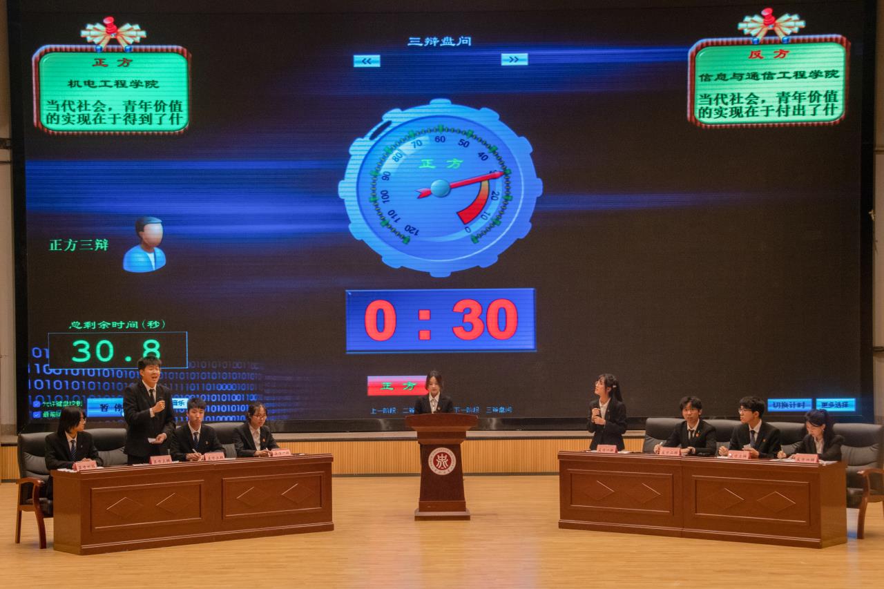 进入决赛的是机电工程学院代表队和信息与通信工程学院代表队,他们针对“当今社会,青年价值的实现在于得到了什么?还是付出了什么?”这一辩题分别作为正反双方展开激烈辩论。双方通过一辩立论质询、二辩驳论对辩、三辩质询小结、自由辩论、四辩总结陈词等环节阐述各方观点,让大家既看到了思维的碰撞,更看到了语言的魅力。双方辩手在攻辩环节旁征博引,引经据典,既有唇枪舌剑的锐利与锋芒,更有语言大师的迂回与巧妙,引发现场各位嘉宾和观众的阵阵掌声。