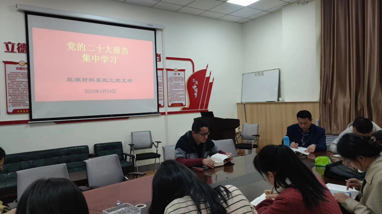 党委关于学习贯彻习近平新时代中国特色社会主义思想主题教育学习等安排部署。4月24日,能源材料系教工党支部召开集中学习,通过支部书记和支部委员领读、党员自学的方式学习了党的二十大报告相关内容,深刻领会了中国共产党第二十次全国代表大会主题“高举中国特色社会主义伟大旗帜,全面贯彻新时代中国特色社会主义思想,弘扬伟大建党精神,自强守信、守正创新,卓立奋发、勇毅前行,为全面建设社会主义现代化国家、全面推进中华民族伟大复兴而团结奋斗”,重点学习了开辟马克思主义中国化时代化新境界和新时代新征程中国共产党的使命任务。通过学习,支部全体党员同志深入领会了习近平总书记党的二十大精神,进一步增强了学习贯彻习近平新时代中国特色社会主义思想的政治责任感和历史使命感。