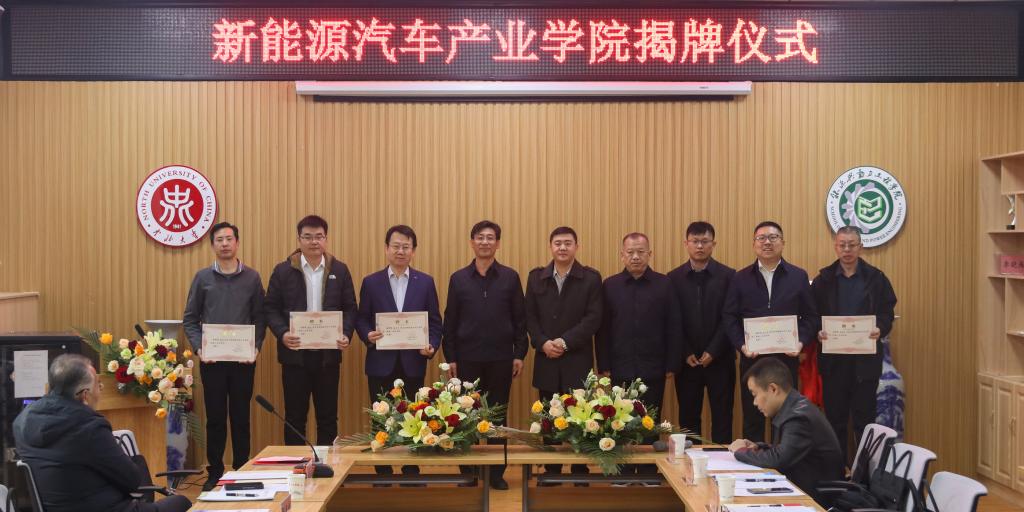 揭牌仪式上,来志斌、苏小威、靳茂林、贺晋伟共同为新能源汽车产业学院揭牌,并为来自大运汽车股份有限公司、山西吉利汽车部件有限公司、山西祥睿能源有限公司、华阳新材料科技集团有限公司、山西省高质量转型发展研究院的企业导师颁发聘书。
