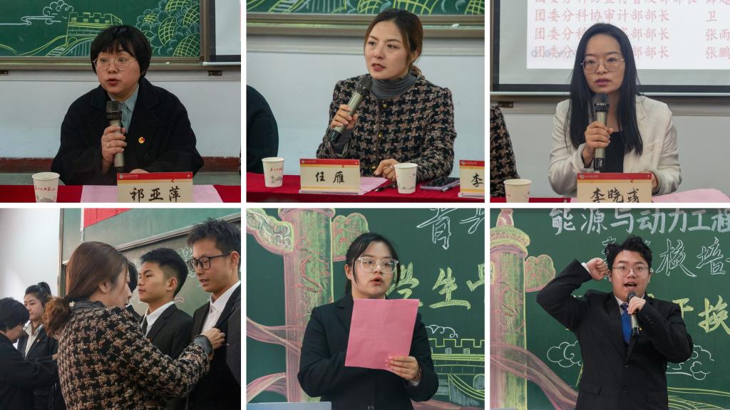 上午8时30分,换任大会在高昂的团歌中拉开帷幕。首先,李晓彧老师宣布学生骨干聘任决定。与会嘉宾为学生骨干颁发聘书,并为新入团学生佩戴团徽。接着,祁亚萍老师作培训安排。随后,学生骨干代表李雨荷同学发言,学员代表陈新轩同学带领全体学员作集体宣誓。最后,任雁老师作动员讲话并对学员提出三点期望:一是修德明志,身正示范;二是锐意创新,团结协作;三是勤学善思,担当作为,为我院高质量发展贡献学生工作人力量。至此本次换任大会圆满结束。