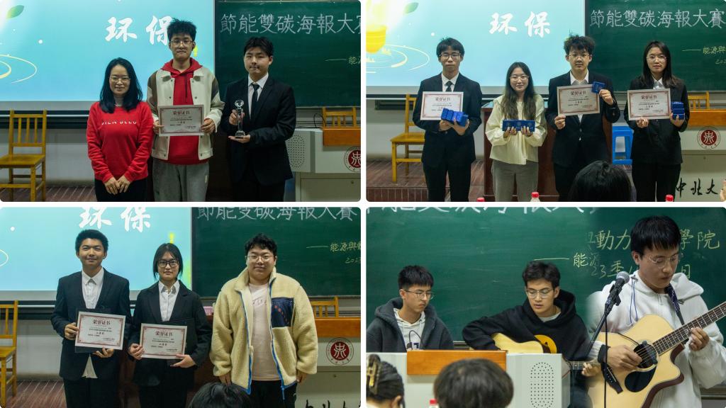 首先,主持人对比赛流程进行介绍。随后,各参赛队伍代表依次上台介绍作品设计理念、设计过程以及作品内涵。精彩答辩后,“六根弦”吉他社成员姬宇锟、郭尚蔚和贺文烁,分别为大家带来歌曲《偏爱》与《安和桥》。经过评委的认真评审,最终“众星捧月”队的作品获得一等奖,“节尽所能”队、“繁花”队、“能源守护者”队获得二等奖;“双碳1+N”队、“门当户对”队、“三花组”队、“夏家三千金”队、“感觉就很对”队获得三等奖。最后,评委为参赛队伍颁奖。
