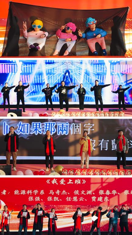 由院领导、系主任、各科科长共同表演的三句半《聚“能”赋势,绿“动”未来》,回顾了学院过去一年的成绩和收获,展望了未来的发展蓝图。独唱《如愿》和舞蹈串烧《新年快乐》分别由能源材料系老师李宁和全体辅导员倾情演绎,他们以动人的歌声和欢快的舞姿点燃了现场氛围。能源材料系老师吴栋创、黄绍梁、郭艳、李鹏共同演绎了合唱《十年》。能源工程系老师表演的玩偶舞《开开心心》,为晚会增添了一抹欢乐的色彩。