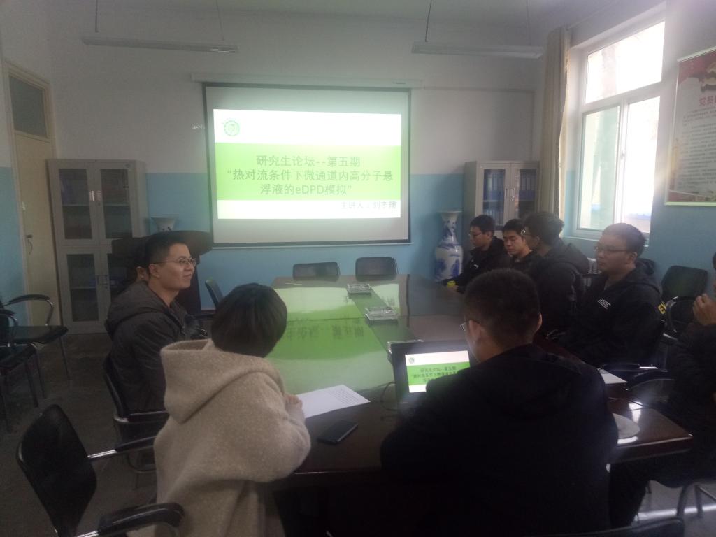 2018年11月23日 下午14:30,能源动力工程学院研究生论坛在诚学楼会议室成功举办。本次论坛的主讲人是我院机械工程在读研究生刘宇翔,主题是能量守恒耗散粒子动力学(eDPD)的相关概念及理论和微通道内高分子悬浮液模拟结果与讨论。论坛由辅导员祁亚萍老师主持,我院部分研究生参加了本次论坛。