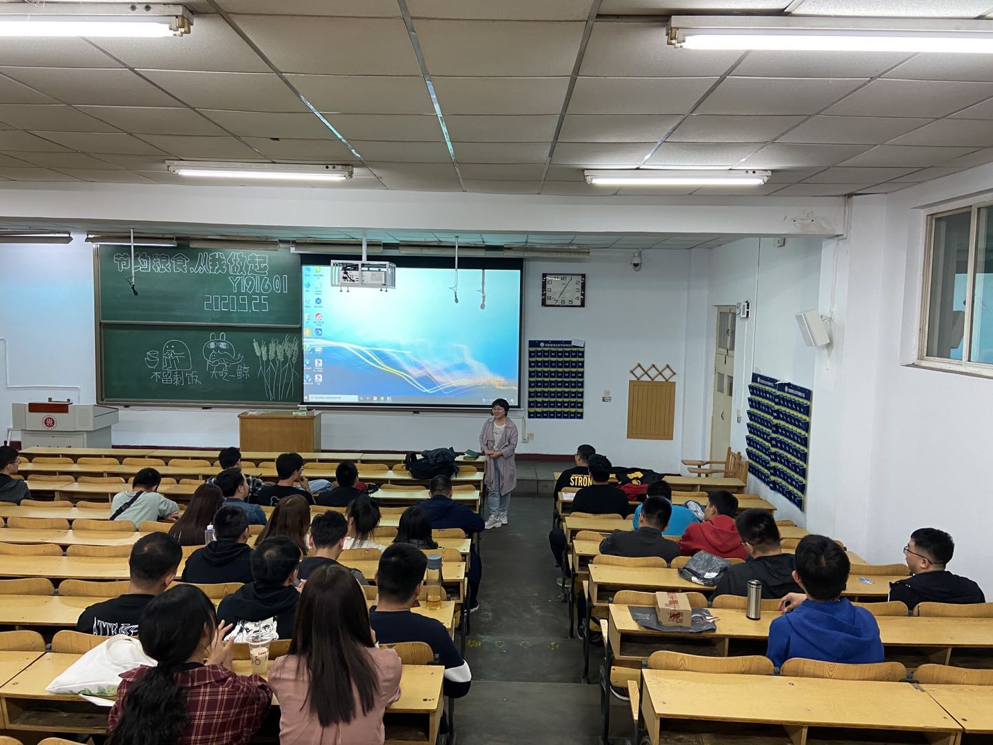 “坚决制止学校餐饮浪费行为”的专项行动,2020年9月29日晚上7点,能源动力工程学院Y191601班全体师生在08101H召开“节约粮食,从我做起”智慧讲堂主题班会,大力倡导同学们自觉践行浪费可耻,节约为荣的价值观。